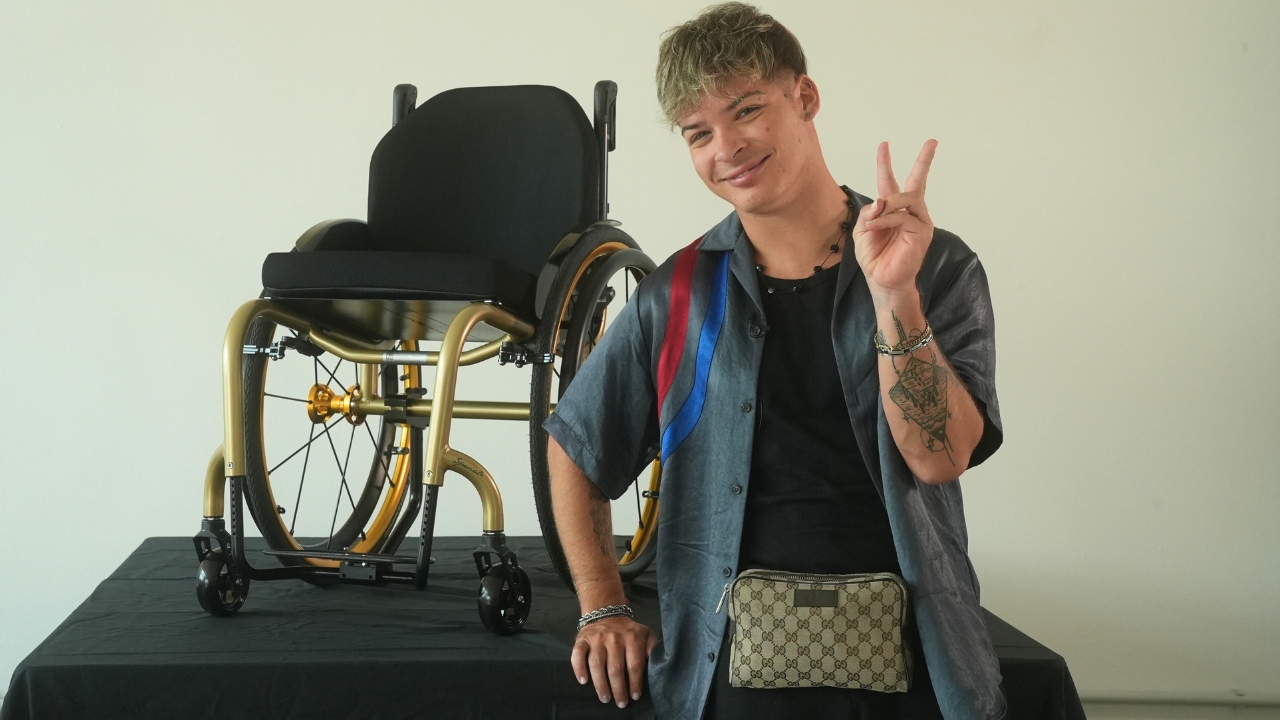 Aria Speciale wheelchair, which is fully customizable and designed for those who, like him, don't accept compromises. Riccardo chose this model for its lightness—a key feature for his autonomy—and its distinctive design with clean lines and extensive customisation options.
