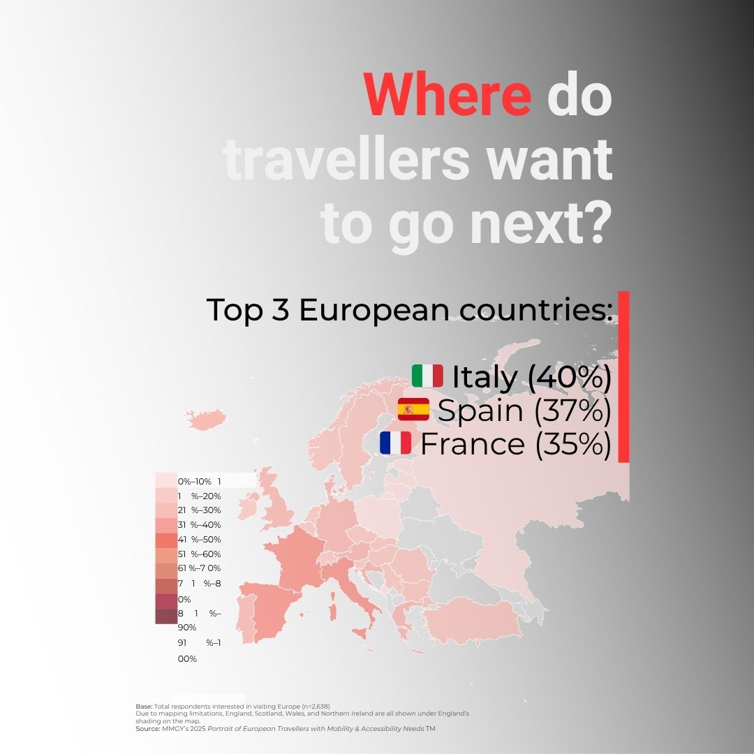 Italy (40%), Spain (37%), and France (35%) lead the rankings of preferred accessible destinations.